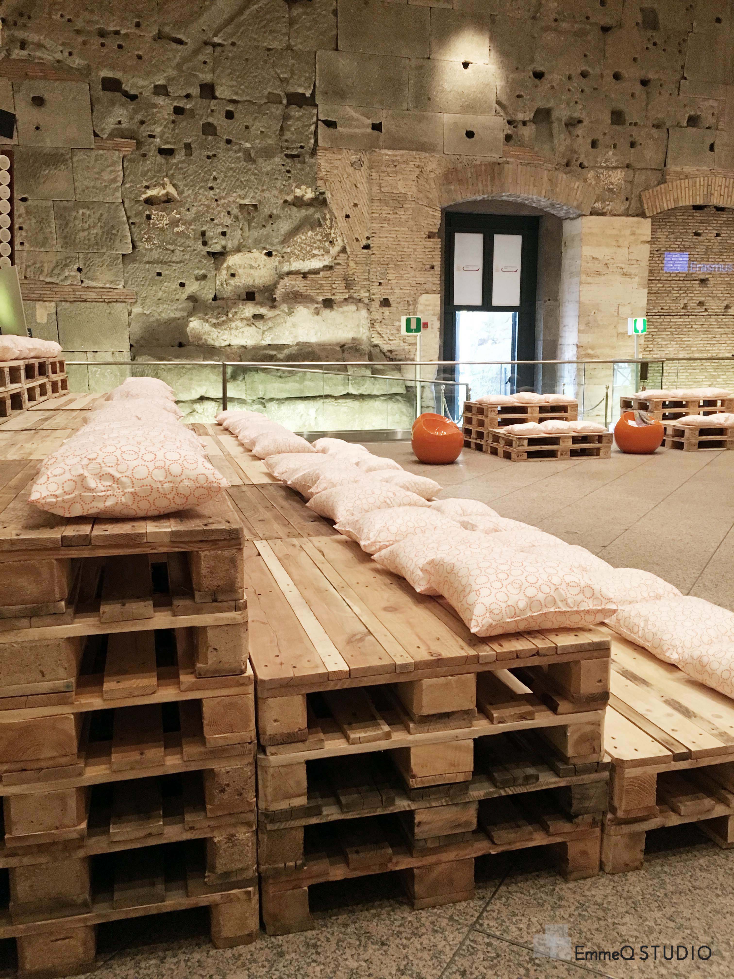Gradonate fisse realizzate con pallet di riuso si alternano a sedute mobili che possono essere organizzate secondo le diverse esigenze di programma, garantendo inoltre massima accessibilità per gli ospiti.